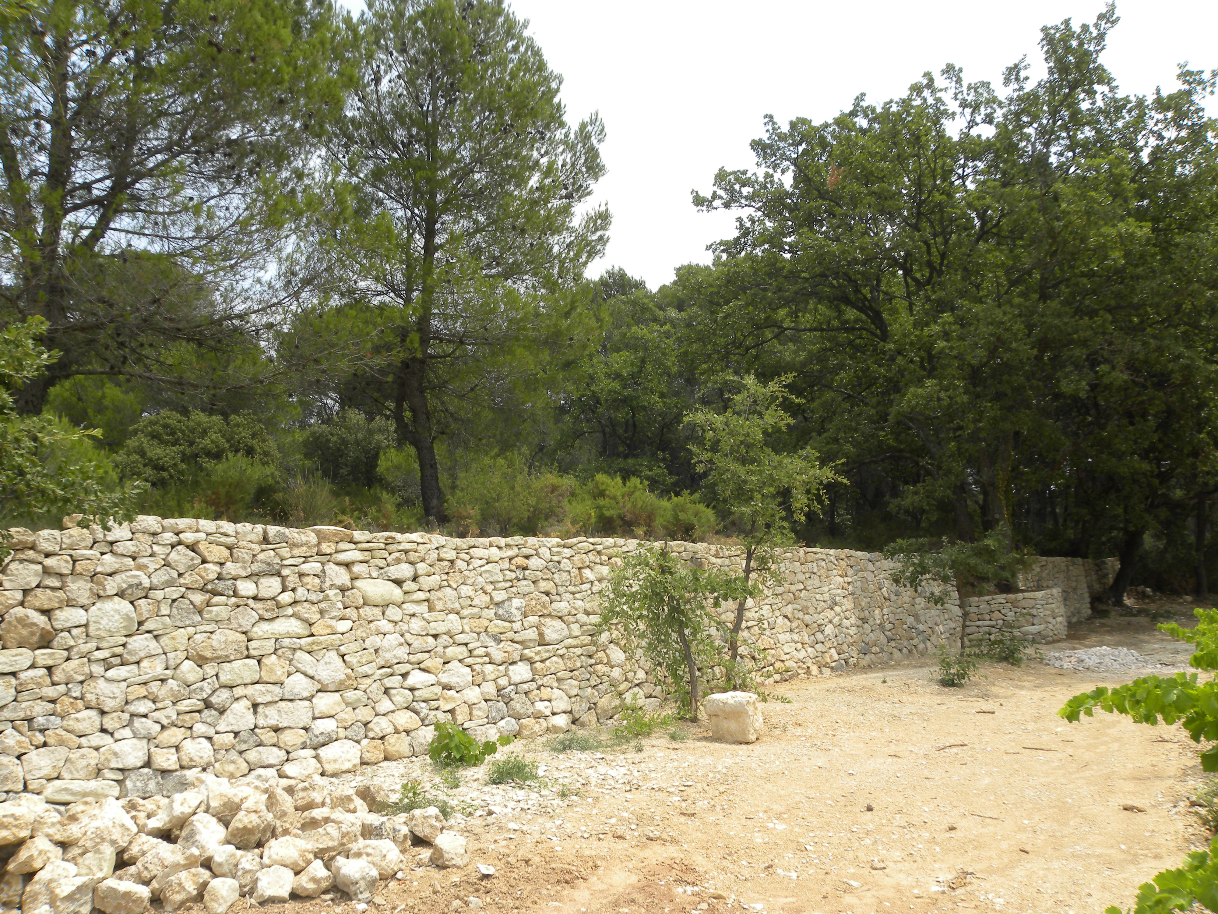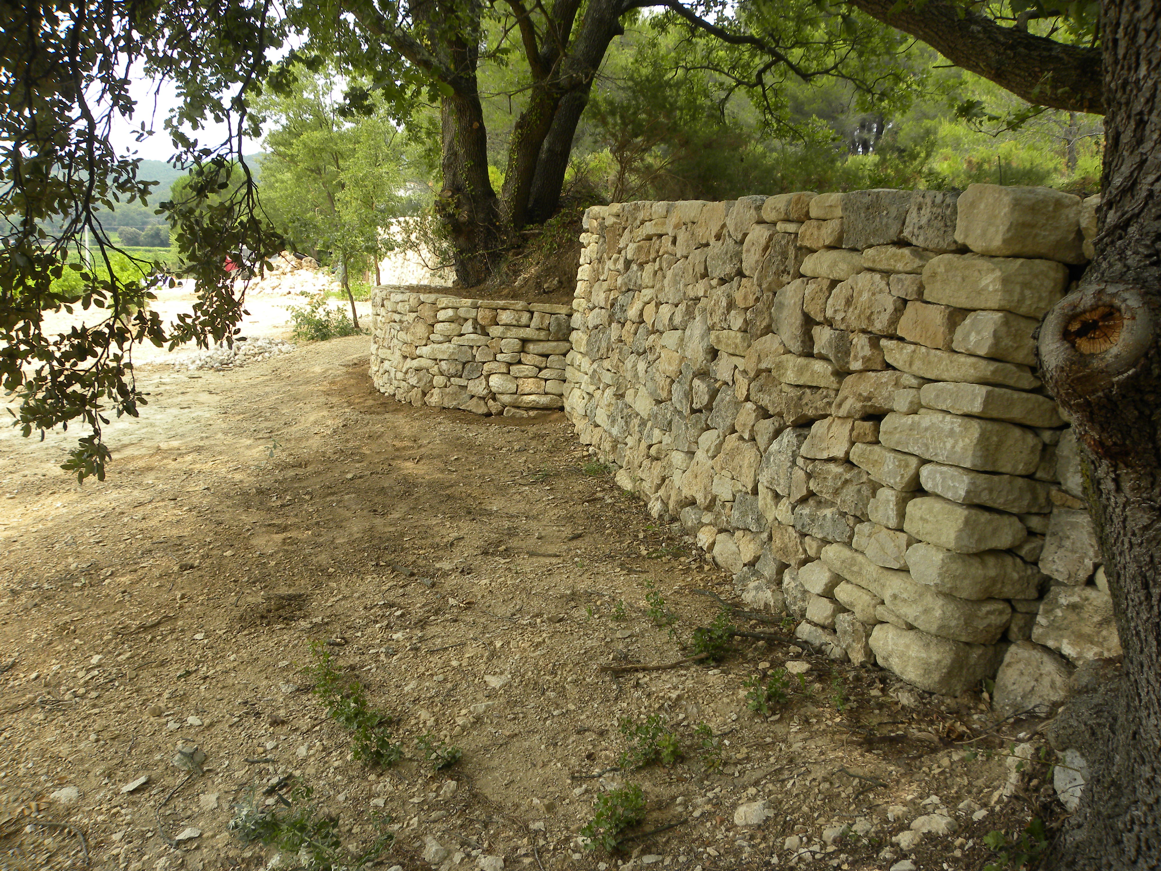 Les murs de droite et de gauche sont des murs de soutènement en pierre sèche dont la base fait environ 1m d’épaisseur. La partie centrale, au niveau des arbres, est désolidarisé des murs de droite et de gauche. Les arbres ne permettant pas de construire un mur de la même épaisseur que ses voisins, il a été décidé de faire un mur d’habillage, purement esthétique. Ce mur est bâti sur les racines de l’arbre ce qui lui confère une durée de vie limitée mais le client souhaitait une continuité esthétique de l’ouvrage.